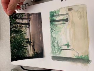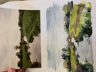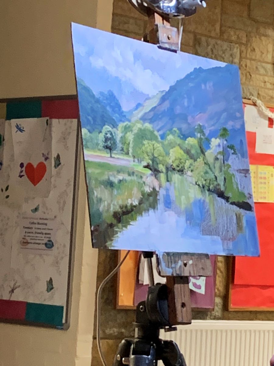 He started by painting the darkest colours, mainly along the riverbank then did the cooler shades of the background. After adding light green highlights to the hills he put in the sky.