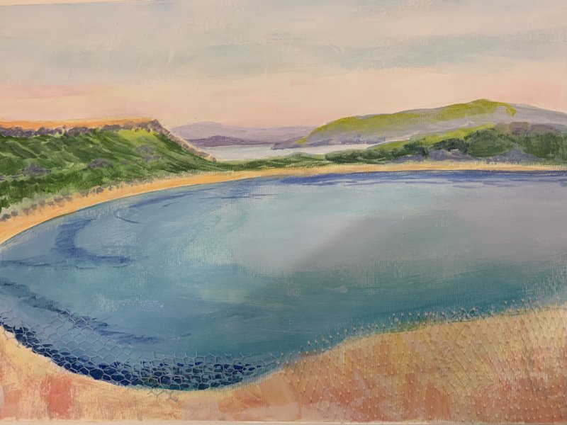 Sky complete, Peter moved on to the left hand bank of trees on the hill, small strokes with a small brush gave good texture. More blue on the distant hill made it receded.