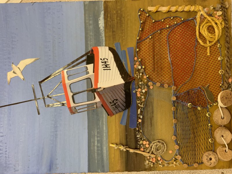 We had a lovely messy night making collage pictures. Not as much chatting as usual early on in the evening as everyone was concentrating on their work. By coffee break there were more cuttings, pieces of string, net and glue on the tables than on the pictures! Everyone relaxed after a ‘cuppa and biscuit’ and by 9.15, with the tables as good as new, we had produced some lovely pieces. We welcomed our newest member, Carol Barnard, from Gumley. |