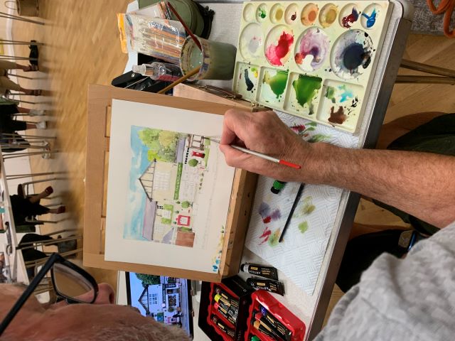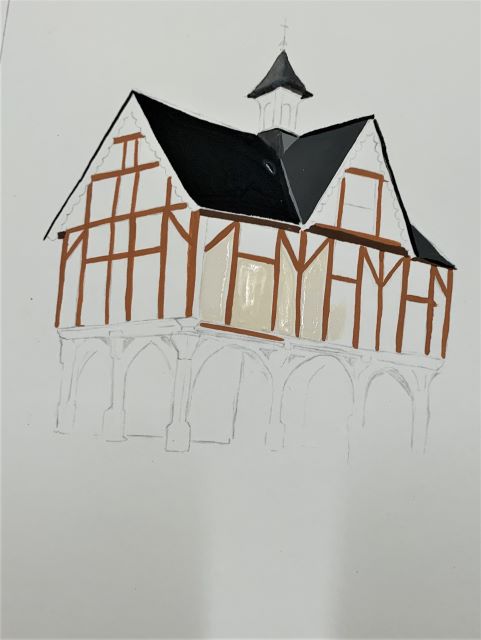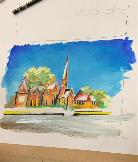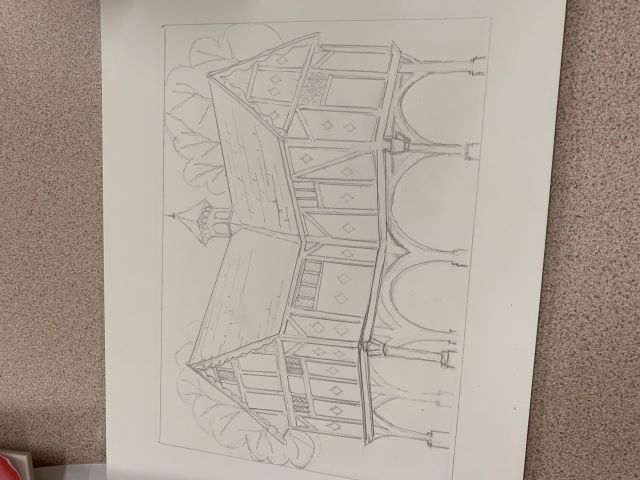 He started with a yellow glaze as a lot of light comes through the scene. Then red lines to determine the perspective lines for the top of the building and the windows.