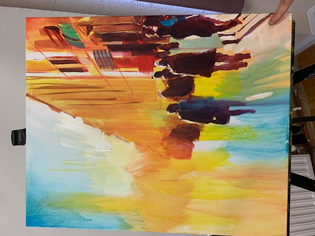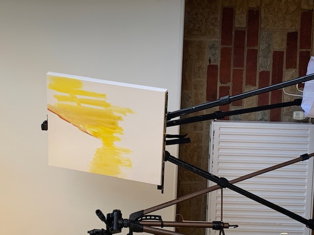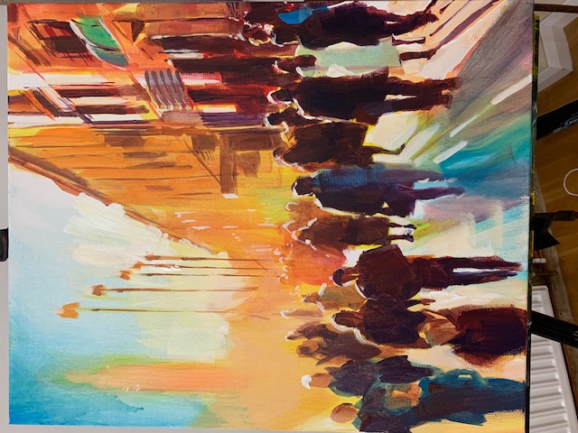 He usually starts a painting using glazes, the paint thinned down with water. This needn’t be the most expensive acrylic on the market at this stage but the better quality paints contain more pigments.