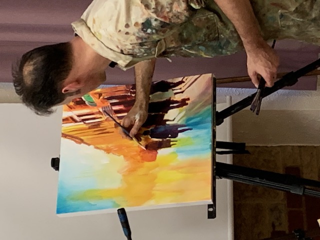 With time running out Glen put in the tower on the left and blended the colour downwards. In front of this he deftly painted the foreground figures then behind them some simple, smaller figures.
