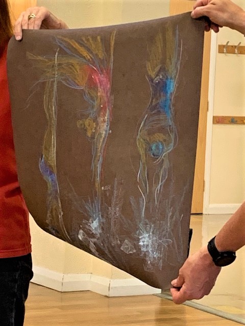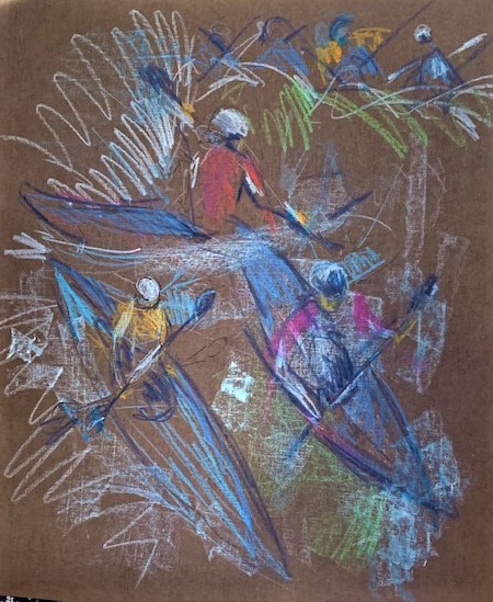 She showed us three large sheets of studies done this week of Divers, Kayaks and Gymnasts using water soluble wax crayons.