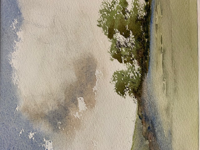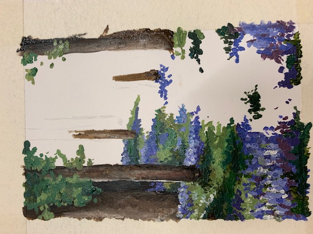Next he put in the blue sky using cerulean blue. To balance the picture he put in a wide vertical line of blue through the foreground and a streak on the right hand side.