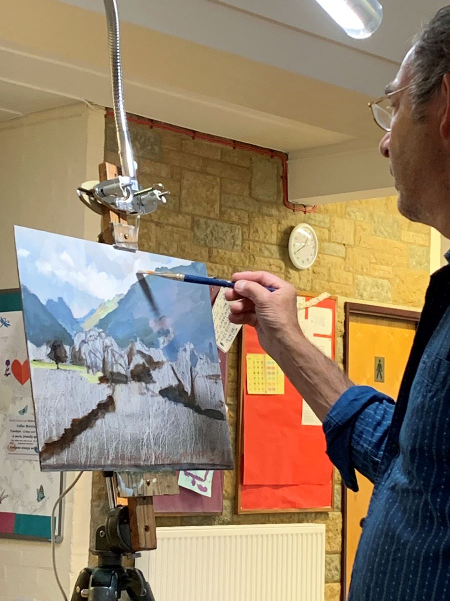 Sky complete, Peter moved on to the left hand bank of trees on the hill, small strokes with a small brush gave good texture. More blue on the distant hill made it receded.