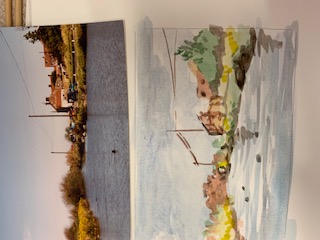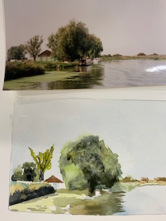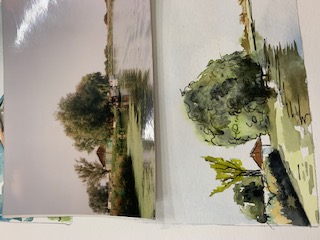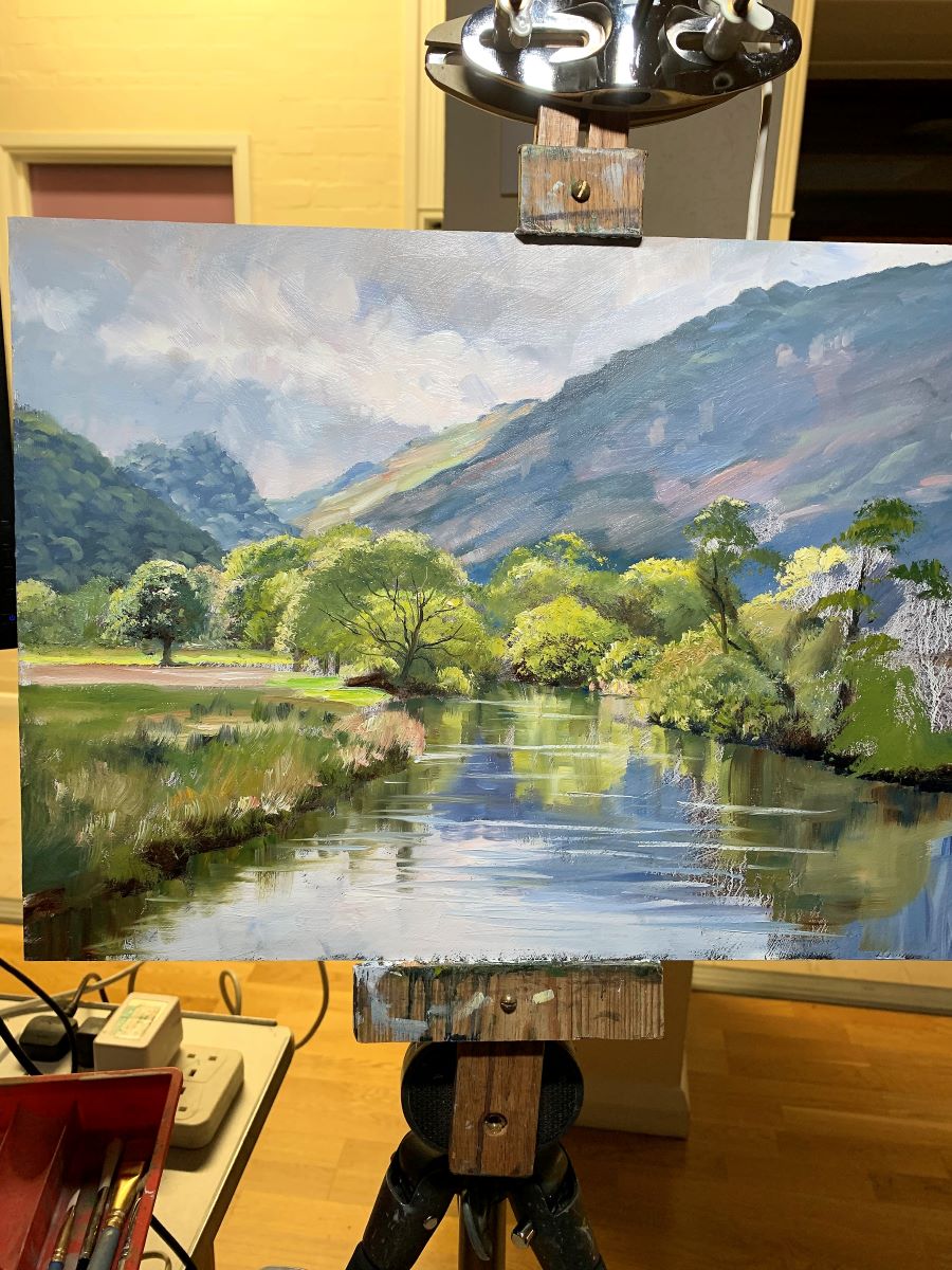 He started by painting the darkest colours, mainly along the riverbank then did the cooler shades of the background. After adding light green highlights to the hills he put in the sky.