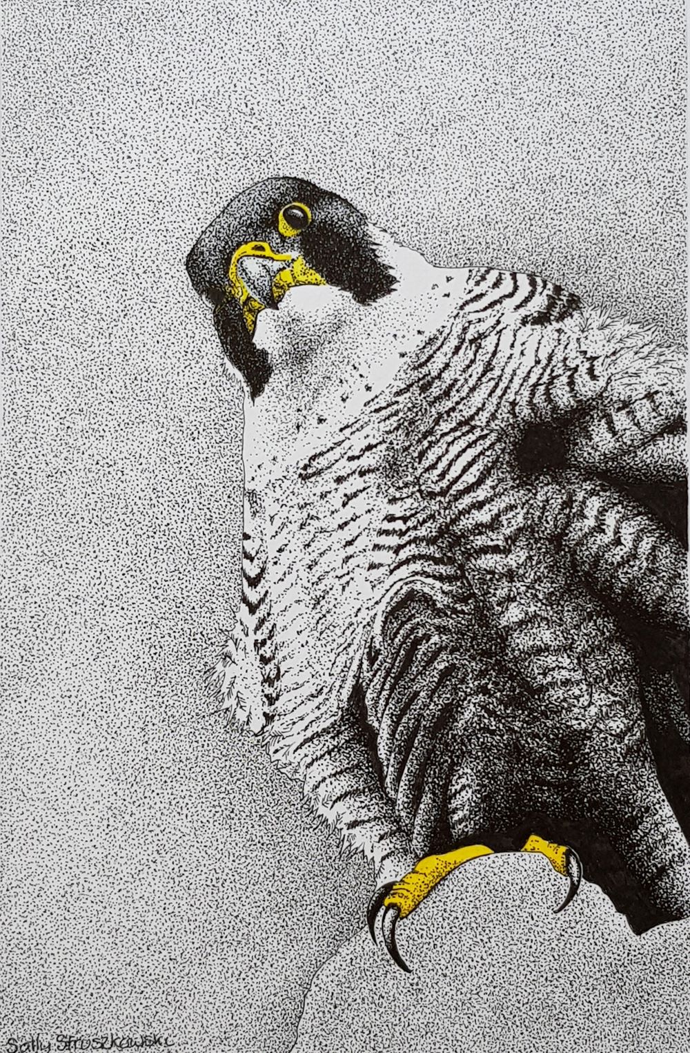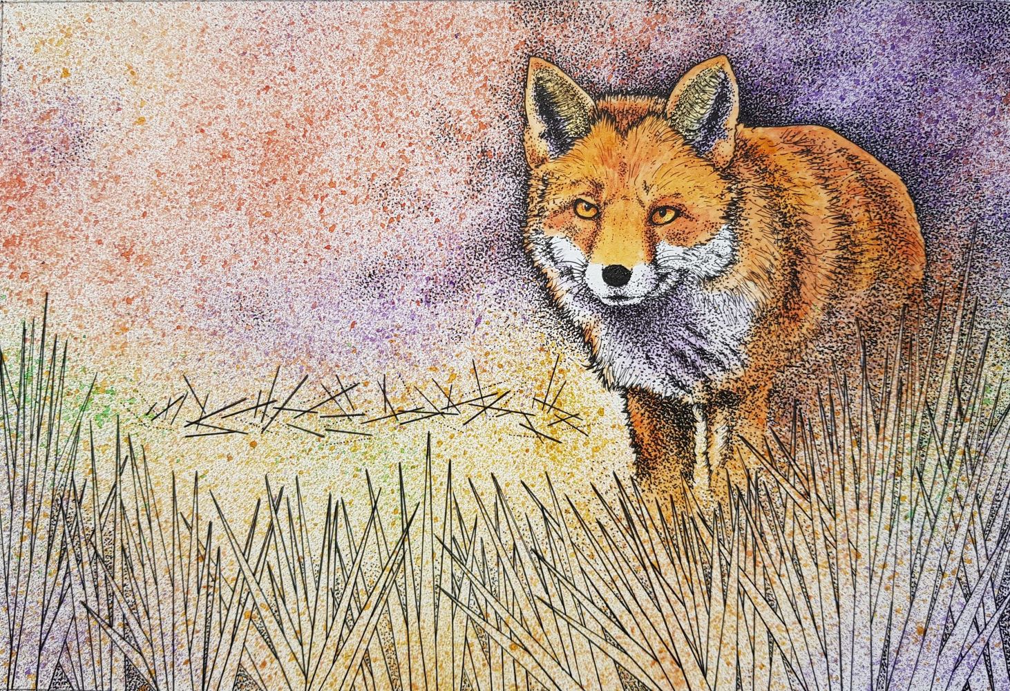 | I have been a member of the Market Harborough Art Club for 6 years and enjoy getting together at the monthly meetings with fellow artists. I have always had a passion for art and I paint and draw. My artwork is produced using pen and ink, and watercolour. I draw rough outlines in pencil and then go over them using a fine nib pen which contains Indian ink.I then sometimes add colour, often just a splatter with a toothbrush. The detail comes last with the ink pen, as I build up texture and shadows with individual dots,the personality of the subject slowly emerging. My favourite subjects are animals and birds, and trees. I like to represent the subject in a realistic, but fresh, sometimes fun, and dramatic way. I have always loved nature and it has always been a significant element in my pictures. A walk in the countryside and spotting different birds and animals has been a favourite pastime since childhood and provides my inspiration. I get great satisfaction in capturing the character of my subjects. |